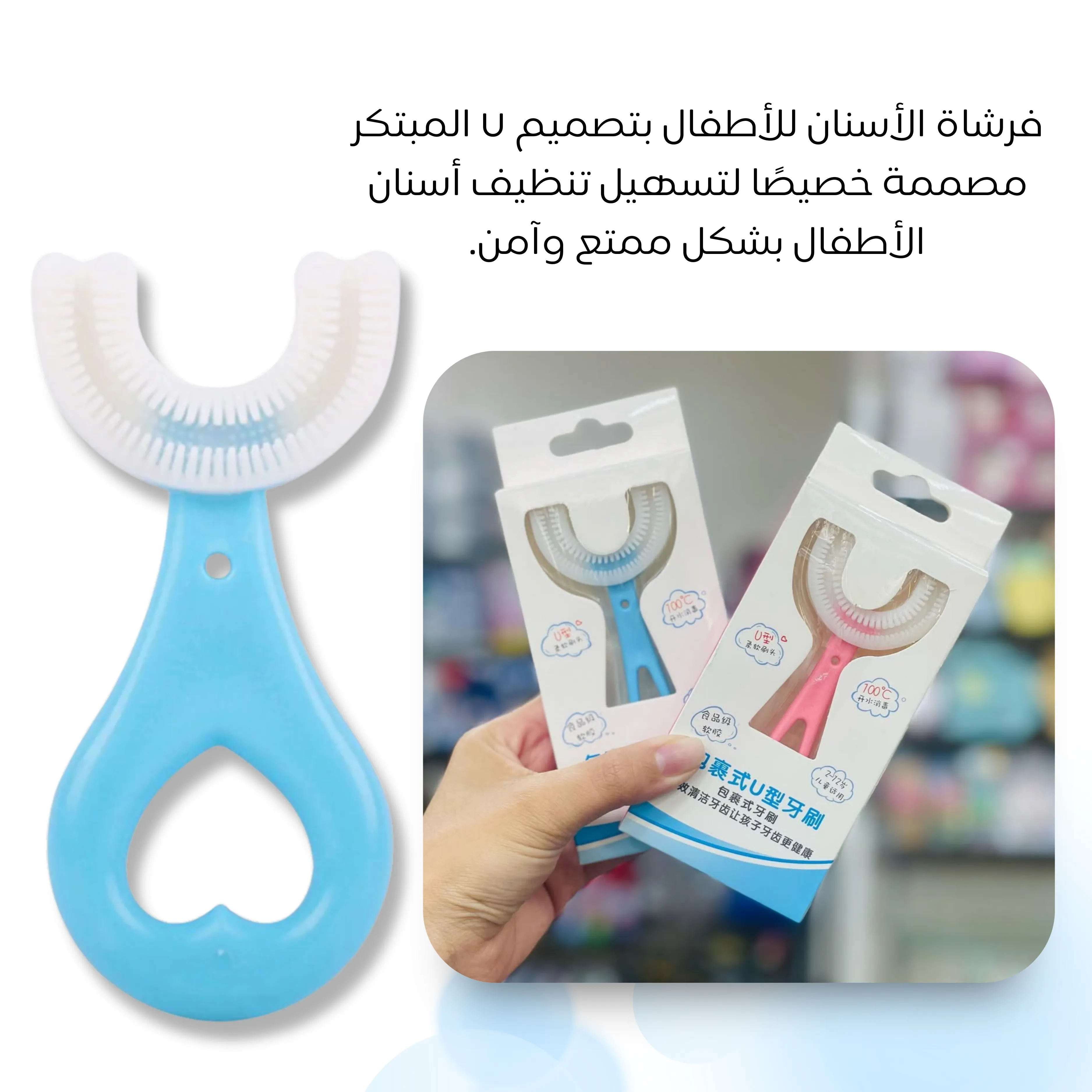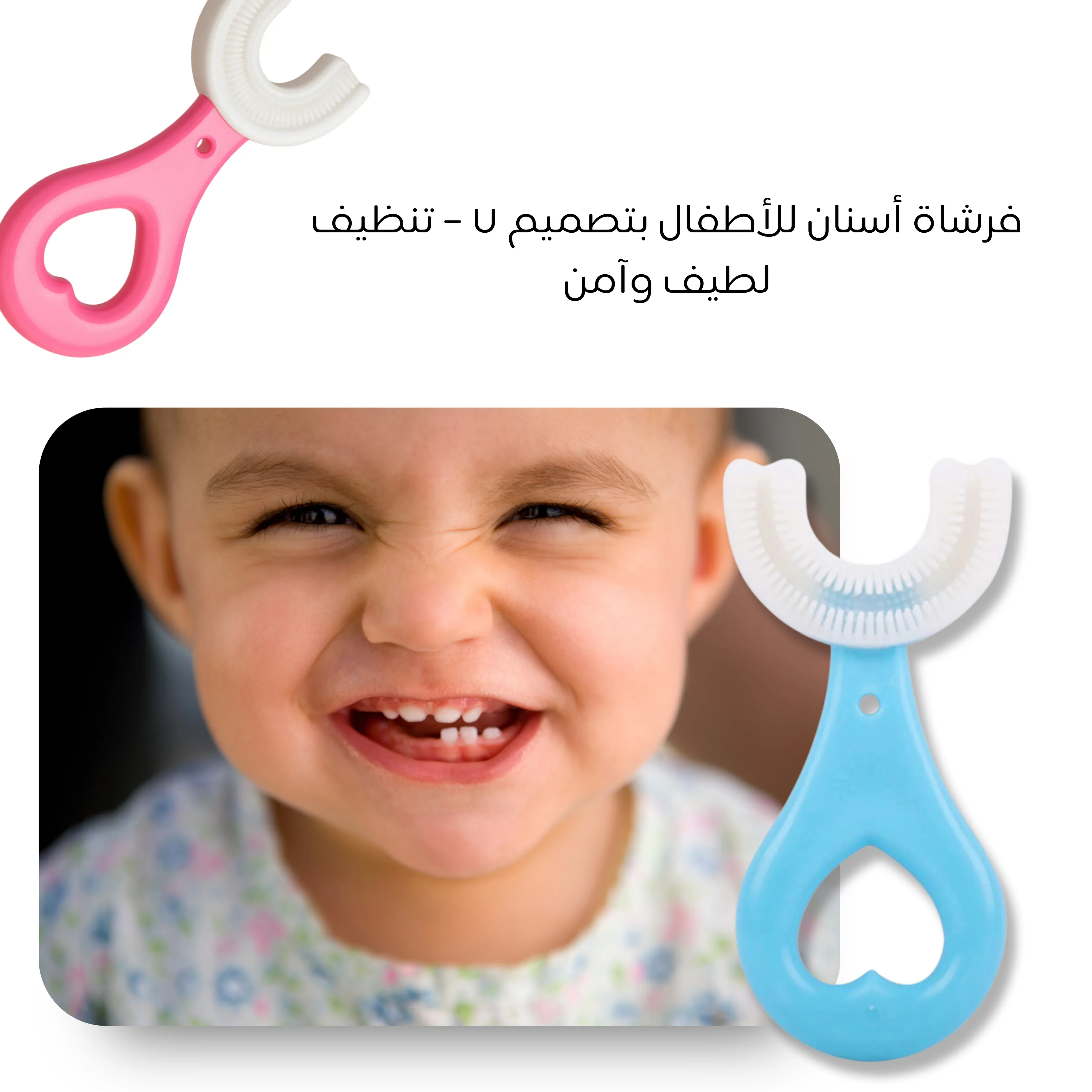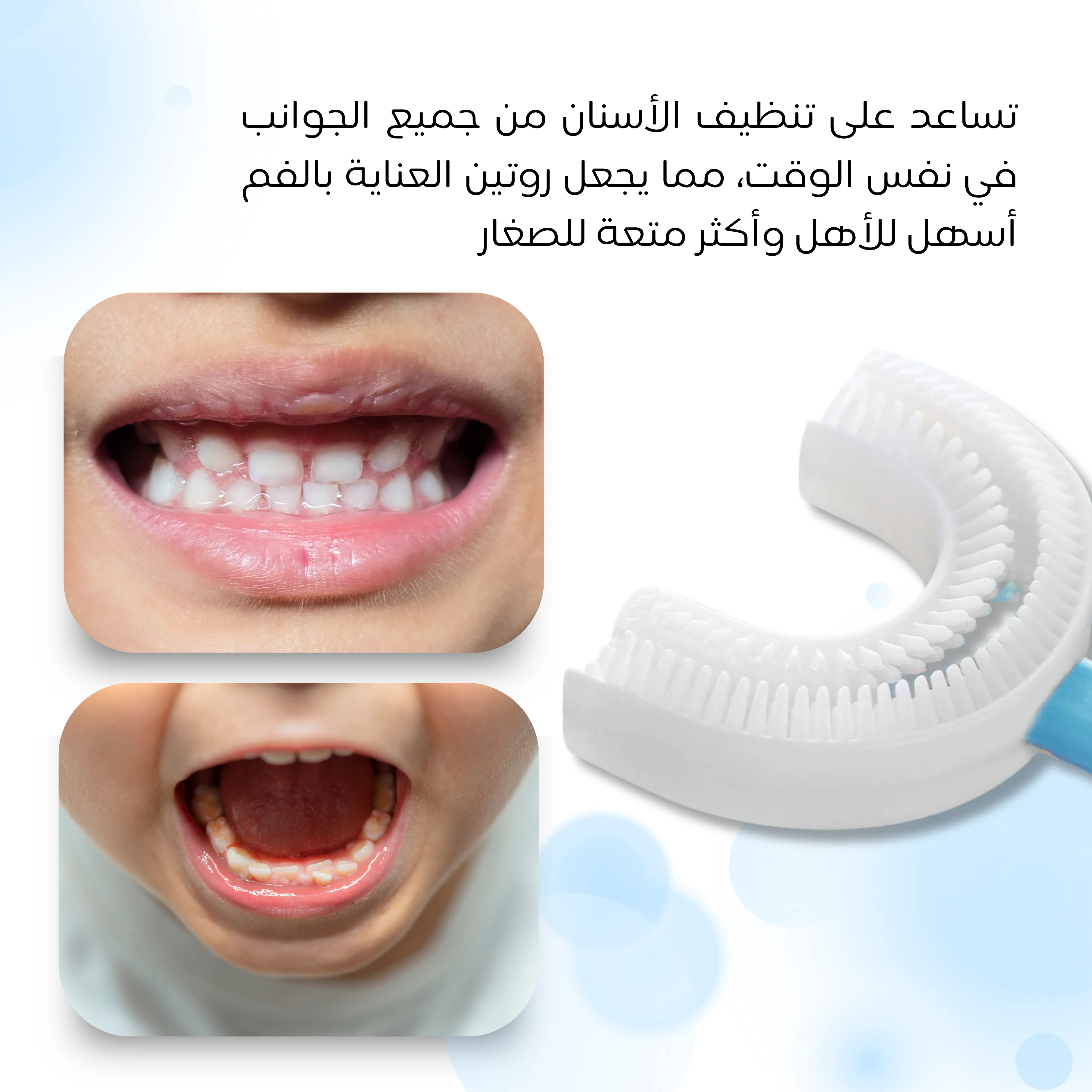 فرشاة رائعة! تصميمها U يسهل تنظيف أسنان طفلي بسرعة، واللثة ما تألمت. صار ينظّف أسنانه بحماس!