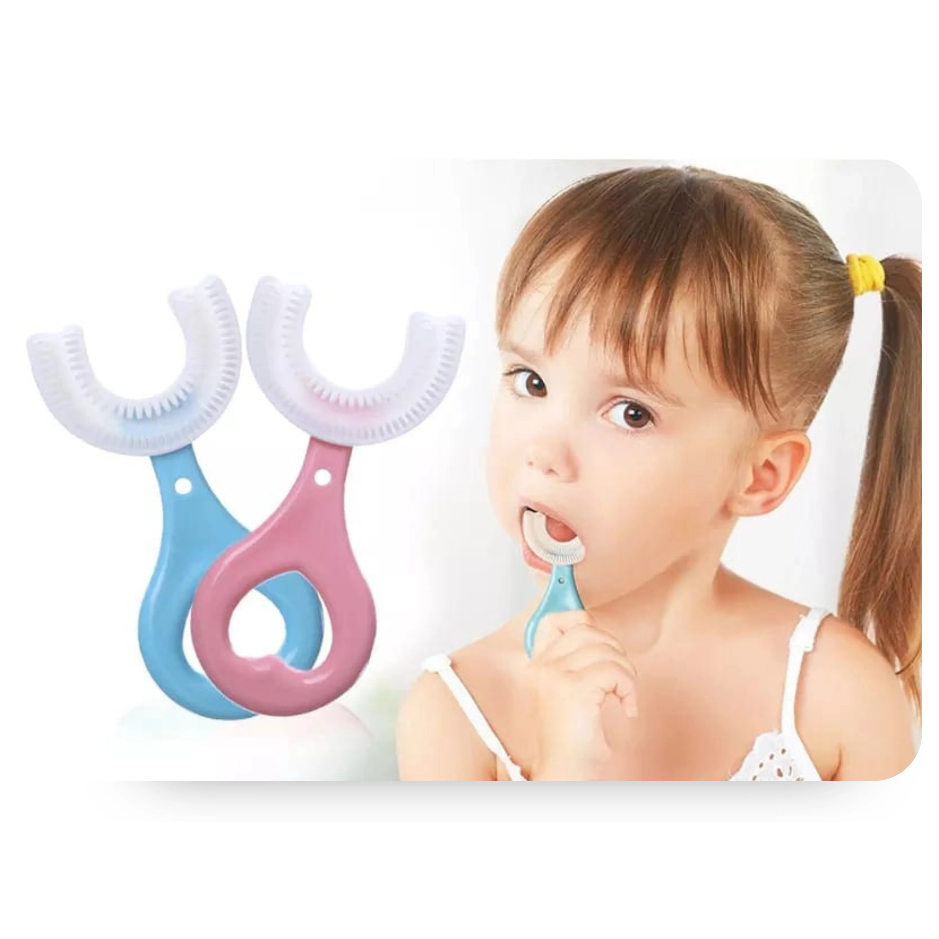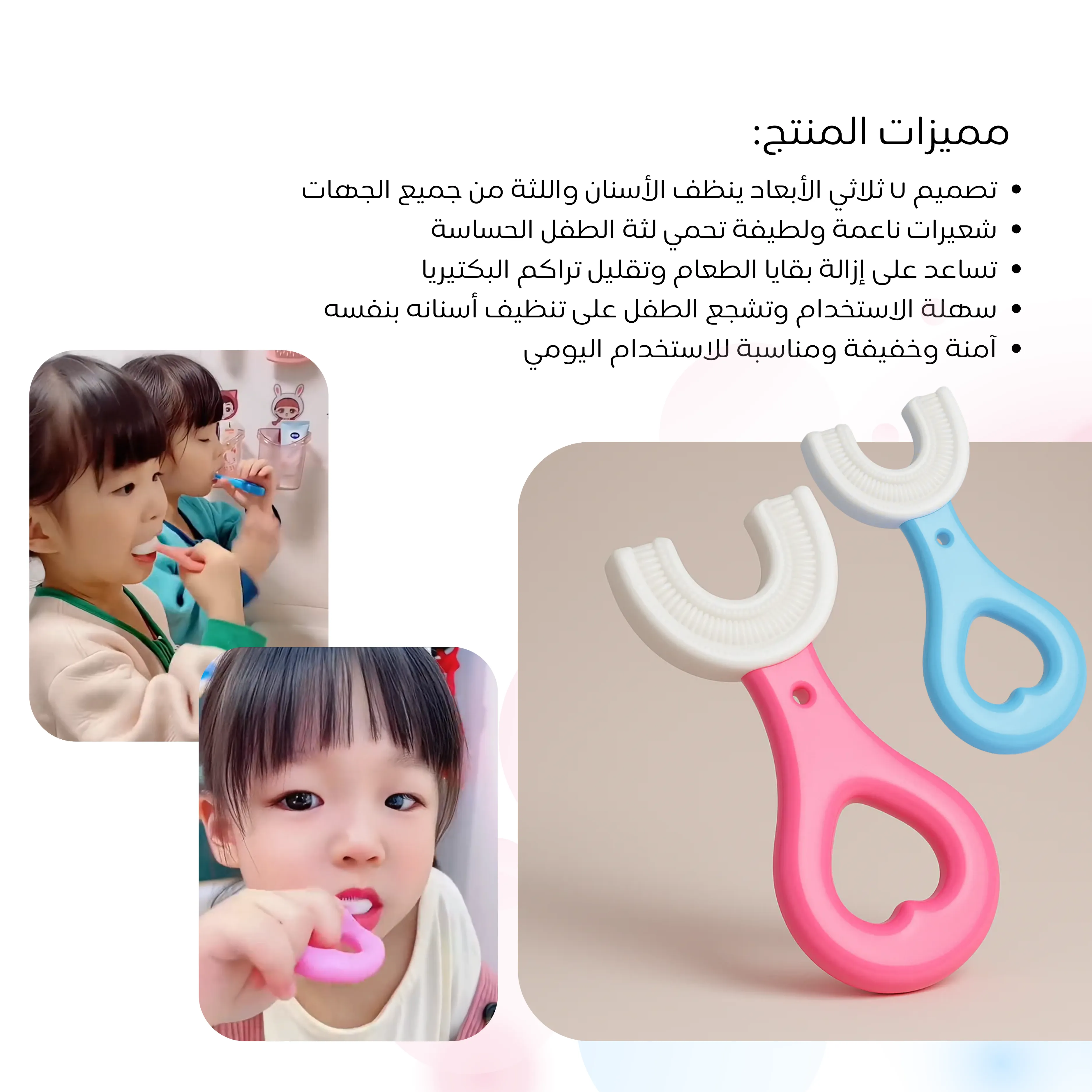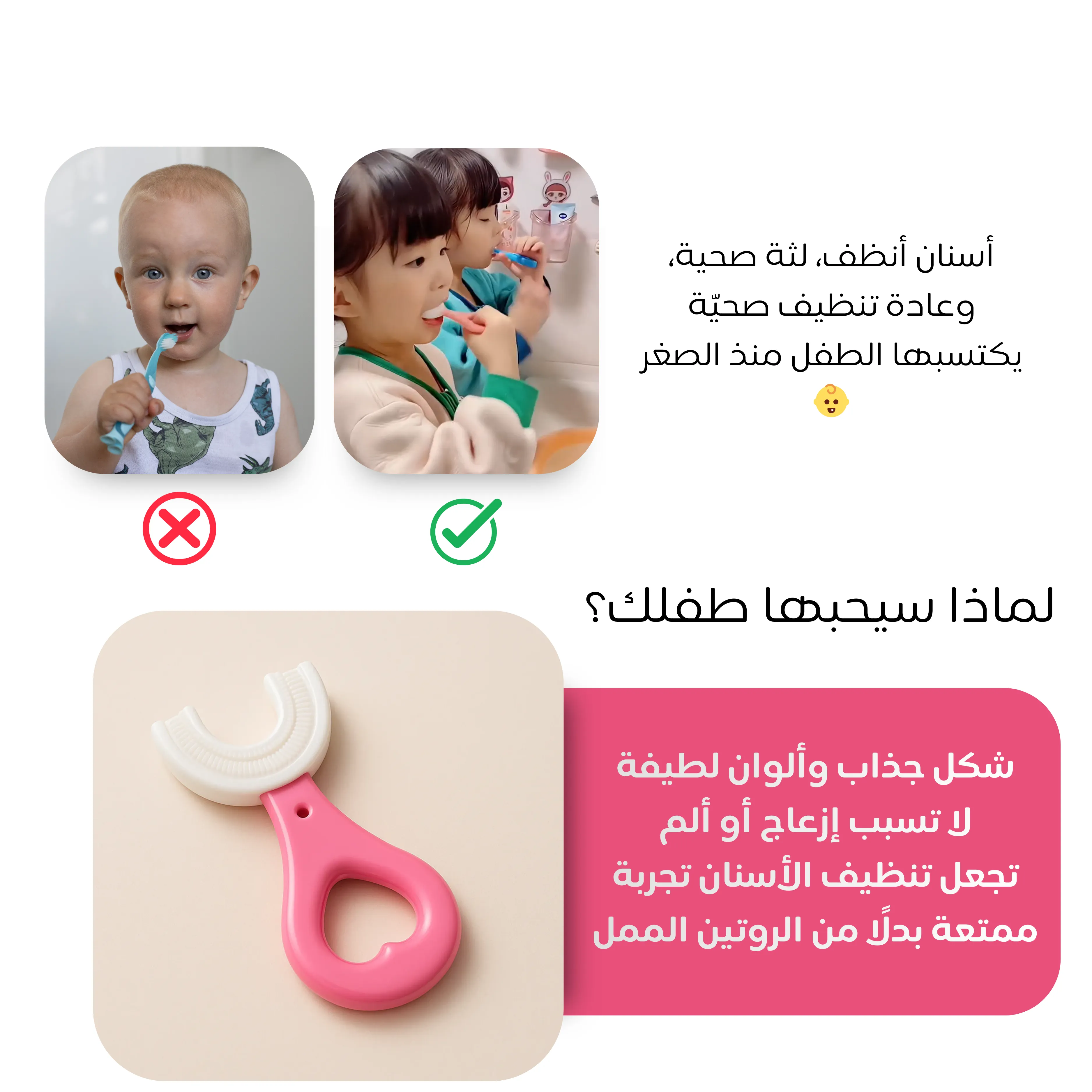 فرشاة رائعة! تصميمها U يسهل تنظيف أسنان طفلي بسرعة، واللثة ما تألمت. صار ينظّف أسنانه بحماس!